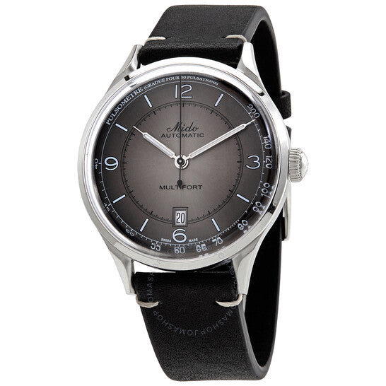 علبة من الفولاذ المقاوم للصدأ مع سوار جلدي أسود. إطار ثابت من الفولاذ المقاوم للصدأ. ميناء بلون الأنثراسيت (الباتينا) مع عقارب ومؤشرات ساعات فضية مضيئة. أرقام عربية تُشير إلى مواقع الساعات 3 و6 و9 و12. علامات الدقائق. مؤشرات مقياس النبض حول الحافة الخارجية. نوع الميناء: تناظري. عقارب ومؤشرات مضيئة. عرض التاريخ عند موضع الساعة 6. حركة أوتوماتيكية من عيار ميدو باورماتيك 80 (ETA C07.621)، مبنية على ETA 2824-2، تحتوي على 23 جوهرة، تنبض بمعدل 21600 ذبذبة في الساعة، وتتمتع باحتياطي طاقة يدوم حوالي 80 ساعة. زجاج ياقوت مقاوم للخدش. غطاء خلفي شفاف. شكل دائري. حجم العلبة: 40 مم. سمك العلبة: 11.95 مم. عرض السوار: 19 مم. مشبك تانغ. مقاومة للماء حتى عمق 50 مترًا / 165 قدمًا. الوظائف: التاريخ، الساعة، الدقيقة، الثانية. سلسلة مالتي فورت. تصميم كاجوال. علامة الساعة: صناعة سويسرية. ساعة ميدو مالتي فورت أوتوماتيكية للرجال بمينا أنثراسيت M0404071606000.