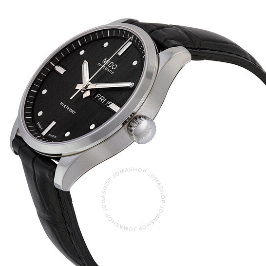علبة من الفولاذ المقاوم للصدأ فضية اللون مع سوار جلدي أسود. إطار ثابت من الفولاذ المقاوم للصدأ فضي اللون. ميناء أسود بعقارب فضية اللون مضيئة وعلامات ساعات منقطة. علامات دقائق حول الحافة الخارجية. نوع الميناء: تناظري. عقارب وعلامات مضيئة. عرض يوم الأسبوع والتاريخ عند موضع الساعة الثالثة. حركة أوتوماتيكية ETA Caliber 2836-2، مبنية على ETA 2824-2، تحتوي على 25 جوهرة، تنبض بمعدل 28800 ذبذبة في الساعة، ولديها احتياطي طاقة لمدة 40 ساعة تقريبًا. زجاج ياقوتي مقاوم للخدش. غطاء خلفي شفاف. شكل العلبة دائري، مقاس العلبة: 42 مم، سمكها: 10.95 مم. عرض السوار: 22 مم. قابلة للطي مع مشبك أمان. مقاومة للماء حتى عمق 100 متر / 330 قدمًا. الوظائف: التاريخ، اليوم، الساعة، الدقيقة، الثانية. سلسلة Multifort. تصميم ساعة كاجوال. ملصق الساعة: صناعة سويسرية. ساعة ميدو مولتي فورت أوتوماتيكية للرجال بمينا أسود M0054301603181.