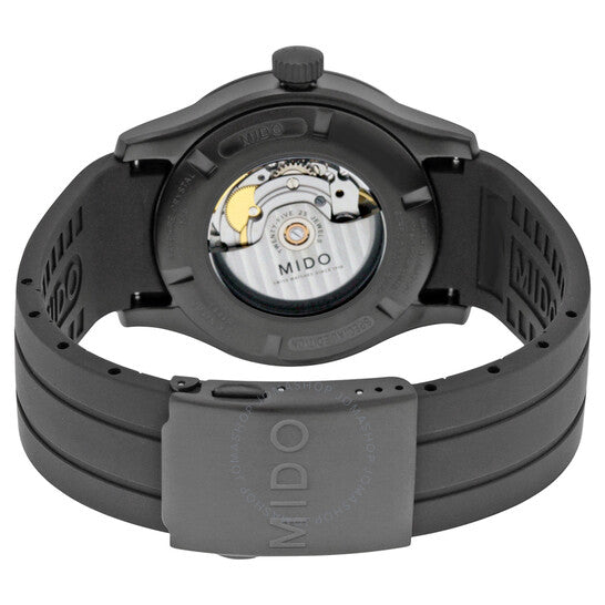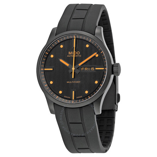 علبة من الفولاذ المقاوم للصدأ مطلية باللون الأسود بتقنية PVD مع سوار مطاطي أسود. إطار ثابت مطلي باللون الأسود بتقنية PVD. ميناء أسود بعقارب برتقالية مضيئة وعلامات ساعات منقطة. علامات دقائق حول الحافة الخارجية. نوع الميناء: تناظري. عقارب وعلامات مضيئة. عرض يوم الأسبوع والتاريخ عند موضع الساعة الثالثة. حركة أوتوماتيكية من عيار ميدو باورماتيك 80 (ETA C07.621)، مبنية على ETA 2824-2، تحتوي على 23 جوهرة، تنبض بتردد 21600 ذبذبة في الساعة، ولديها احتياطي طاقة يصل إلى 80 ساعة تقريبًا. زجاج من الياقوت المقاوم للخدش. تاج لولبي. غطاء خلفي شفاف. شكل دائري. حجم العلبة: 42 مم. سمك العلبة: 10.95 مم. عرض السوار: 22 مم. مشبك قابل للطي بزر ضغط. مقاومة للماء حتى عمق 100 متر / 330 قدمًا. الوظائف: التاريخ، اليوم، الساعة، الدقيقة، الثانية. سلسلة Multifort. تصميم كاجوال أنيق. علامة الساعة: صناعة سويسرية. ساعة ميدو مولتي فورت أوتوماتيكية للرجال بمينا أسود M0054303705180.