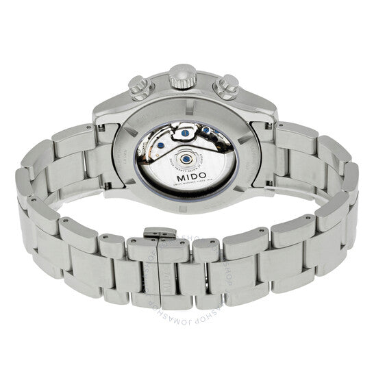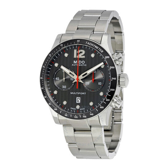 علبة من الفولاذ المقاوم للصدأ مع سوار من الفولاذ المقاوم للصدأ. إطار ثابت من الفولاذ المقاوم للصدأ مع حلقة سوداء مطلية بتقنية PVD تُظهر علامات مقياس سرعة الدوران. ميناء أسود بعقارب رمادية مضيئة وعلامات ساعات منقطّة. يظهر رقم عربي عند موضع الساعة 12. علامات دقائق حول الحافة الخارجية. نوع الميناء: تناظري. عقارب وعلامات مضيئة. عرض التاريخ عند موضع الساعة 6. كرونوغراف - ميناءان فرعيان يعرضان: 60 ثانية و30 دقيقة. حركة أوتوماتيكية من عيار ميدو 60، مبنية على فالجو 7753، تحتوي على 27 جوهرة، تنبض بمعدل 28800 ذبذبة في الساعة، ولديها احتياطي طاقة لمدة 60 ساعة تقريبًا. كريستال ياقوت مقاوم للخدش. تاج لولبي. غطاء خلفي شفاف. شكل دائري. حجم العلبة: 44 مم. سمك العلبة: 14.7 مم. عرض السوار: 20 مم. مشبك قابل للطي بزر ضغط للتحرير. مقاومة للماء حتى عمق ١٠٠ متر / ٣٣٠ قدمًا. الوظائف: كرونوغراف، تاريخ، ساعات، دقائق، ثوانٍ، مقياس سرعة الدوران. سلسلة مولتي فورت. تصميم فاخر. علامة الساعة: صناعة سويسرية. ساعة ميدو مولتي فورت كرونوغراف أوتوماتيكية للرجال M025.627.11.061.00.