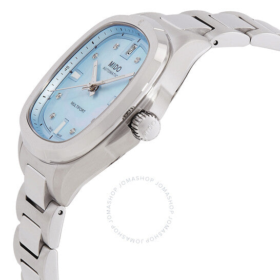 علبة وسوار من الفولاذ المقاوم للصدأ فضي اللون. إطار ثابت من الفولاذ المقاوم للصدأ فضي اللون. ميناء أزرق من عرق اللؤلؤ مع عقارب فضية اللون وعلامات ساعات من الألماس. علامات دقائق حول الحافة الخارجية. نوع الميناء: تناظري. عرض التاريخ عند موضع الساعة ١٢. حركة أوتوماتيكية مع احتياطي طاقة لمدة ٧٢ ساعة. زجاج ياقوت مقاوم للخدش. غطاء خلفي صلب. مقاس العلبة: ٣٥ × ٣٤.٢ مم، سمكها: ٩.٣ مم. عرض السوار: ١٨ مم. مشبك قابل للطي. مقاومة للماء حتى عمق ١٠٠ متر / ٣٣٠ قدمًا. الوظائف: التاريخ، الساعة، الدقائق، الثواني. سلسلة مالتي فورت التلفزيونية. تصميم كاجوال. علامة الساعة: صناعة سويسرية. ساعة ميدو مالتي فورت التلفزيونية الأوتوماتيكية المرصعة بالألماس M0493071113600.