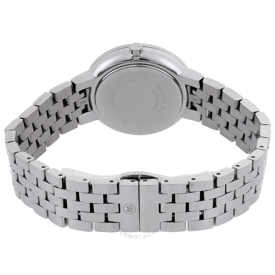 علبة من الفولاذ المقاوم للصدأ مع سوار فضي اللون. إطار ثابت من الفولاذ المقاوم للصدأ. ميناء من الطين. نوع الميناء: تناظري. حركة كوارتز. زجاج ياقوت مقاوم للخدش. غطاء خلفي صلب. شكل العلبة دائري، مقاسها: ٢٩.٥ مم. مشبك قابل للطي مع قفل أمان. مقاومة للماء حتى عمق ٣٠ مترًا / ١٠٠ قدم. الوظائف: الساعات، الدقائق. سلسلة "ميوزيام كلاسيك". تصميم ساعة كاجوال. علامة الساعة: صناعة سويسرية. ساعة موفادو "ميوزيام كلاسيك" كوارتز نسائية ٠٦٠٧٩٤١.