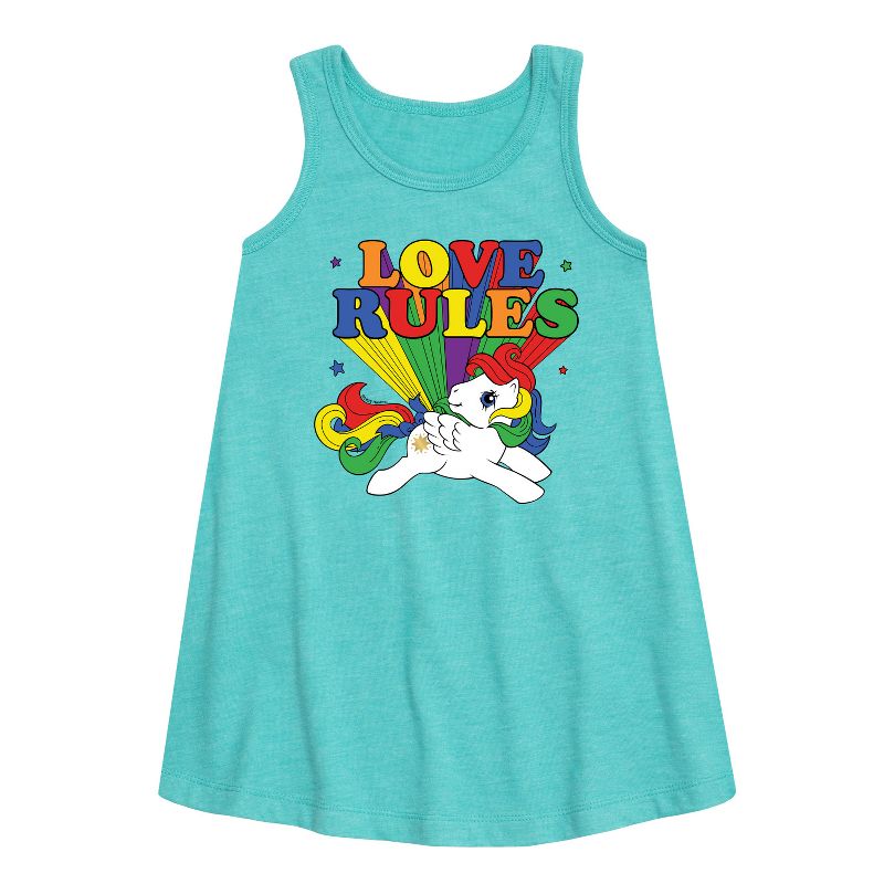 ماي ليتل بوني - قواعد حب قوس قزح - فستان بناتي بتصميم خطي - انطلقي في رحلة ساحرة عبر عالم ماي ليتل بوني الساحر مع مجموعتنا الساحرة من الملابس الجرافيكية. صُنعت تيشيرتنا وبلوزاتنا ذات القلنسوة من مواد فاخرة تضمن الراحة والمتانة، وهي تحتفي بالشخصيات المحبوبة من الأجيال القديمة والحديثة. من مهور بونيفيل الكلاسيكية إلى سكان إكوستريا النابضين بالحياة، تتميز تصاميمنا بشخصيات شهيرة مثل توايلايت سباركل، رينبو داش، بينكي باي، راريتي، آبلجاك، وفلاترشاي. سواء كنتِ من محبي السلسلة الأصلية أو النسخة الحديثة، فإن ملابسنا تجسد سحر وروعة الصداقة التي تُميز عالم ماي ليتل بوني.