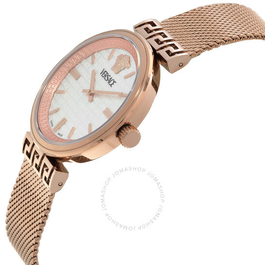 علبة من الفولاذ المقاوم للصدأ بلون الذهب الوردي، مع سوار شبكي من الفولاذ المقاوم للصدأ بلون الذهب الوردي. إطار ثابت من الفولاذ المقاوم للصدأ بلون الذهب الوردي. ميناء فضي مع عقارب ومؤشرات ساعات بلون الذهب الوردي. نوع الميناء: تناظري. حركة كوارتز. زجاج من الياقوت المقاوم للخدش. تاج قابل للسحب/الدفع. غطاء خلفي صلب. شكل دائري، مقاس العلبة: 36 مم. عرض السوار: 18 مم. مشبك منزلق. مقاومة للماء حتى عمق 50 مترًا / 165 قدمًا. الوظائف: الساعات، الدقائق. سلسلة ميثوس. تصميم كاجوال. علامة الساعة: صناعة سويسرية. ساعة فيرساتشي ميثوس كوارتز نسائية بمينا فضي VETCA0624.
