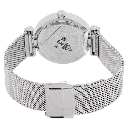 علبة من الفولاذ المقاوم للصدأ فضية اللون مع سوار شبكي فضي اللون. إطار ثابت من الفولاذ المقاوم للصدأ فضي اللون. ميناء فيروزي مع عقارب فضية اللون وعلامات ساعات. نوع الميناء: تناظري. حركة كوارتز. زجاج ياقوت مقاوم للخدش. تاج قابل للسحب/الدفع. غطاء خلفي صلب. شكل دائري، مقاس العلبة: 36 مم. عرض السوار: 18 مم. مشبك منزلق. مقاومة للماء حتى عمق 50 مترًا / 165 قدمًا. الوظائف: الساعات، الدقائق. سلسلة ميثوس. تصميم كاجوال. علامة الساعة: صناعة سويسرية. ساعة فيرساتشي ميثوس كوارتز نسائية بمينا فيروزي VETCA0324.