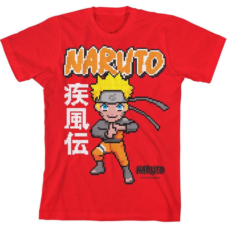 - تيشيرت برسومات جرافيكية: يزين هذا التيشيرت الصبي صورة ناروتو تشيبي لطيفة مصنوعة من البكسلات. تظهر أحرف كانجي بيضاء بجانب ناروتو، وأحرف برتقالية فوقه تُهجّى اسمه. سيُعجب عشاق الأنمي الصغار بهذا التيشيرت.