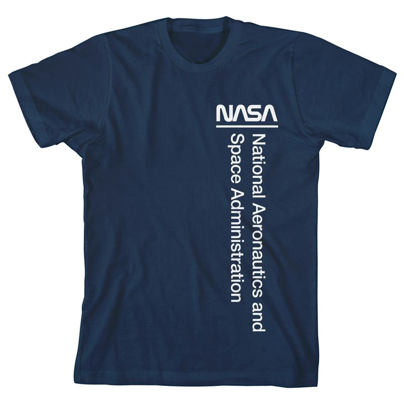 - تي شيرت جرافيكي: يظهر شعار ناسا بأحرف بيضاء في الجزء العلوي من هذا التي شيرت بينما توضح الأحرف البيضاء الجانبية أدناه معنى الاختصار. الأطفال الذين يحلمون باستكشاف الحدود النهائية سوف يحبون هذا التي شيرت.