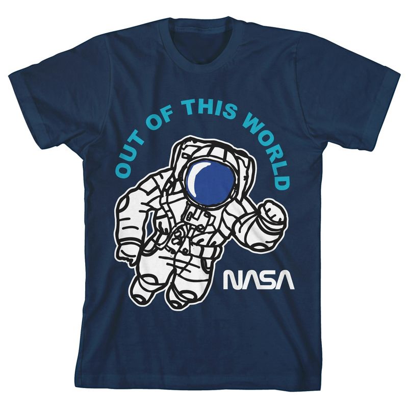 - تصميم مخصص - تتميز ملابس مشجعي برنامج الفضاء التابع لوكالة ناسا للشباب برسومات جريئة لرائد فضاء مع النص "Out of This World" على خلفية زرقاء داكنة، مطبوعة بشكل احترافي للحصول على لون وجودة طباعة تدوم طويلاً.