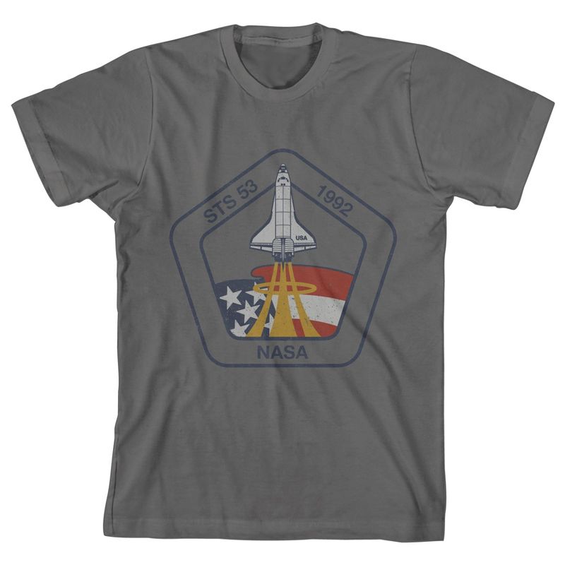 - تيشيرت برسومات جرافيكية: ينطلق مكوك فضائي في رحلته، وتظهر نجوم وخطوط العلم الأمريكي أسفله في التصميم الجرافيكي لهذا التيشيرت. كُتب على الحروف البحرية المحيطة بالصورة: "STS 53، 1992، ناسا".