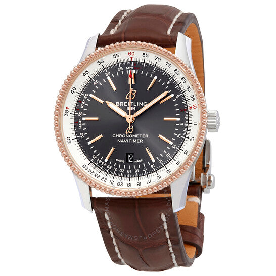 علبة من الفولاذ المقاوم للصدأ مع سوار من جلد التمساح البني. إطار دوار أحادي الاتجاه من الذهب الوردي عيار 18 قيراطًا. ميناء من الكربون بلون الأنثراسيت مع عقارب وعلامات ساعات مضيئة من الذهب الوردي. علامات دقائق. علامات تاكيميتر حول الحافة الخارجية. نوع الميناء: تناظري. عقارب وعلامات مضيئة. عرض التاريخ عند موضع الساعة السادسة. حركة بريتلينغ أوتوماتيكية كاليبر 17، مبنية على ETA 2824-2، تحتوي على 25 جوهرة، تنبض بمعدل 28800 ذبذبة في الساعة، ولديها احتياطي طاقة لمدة 42 ساعة تقريبًا. زجاج ياقوت مقاوم للخدش. تاج قابل للسحب/الدفع. غطاء خلفي صلب. شكل دائري. حجم العلبة: 41 مم. سمك العلبة: 10 مم. عرض السوار: 22 مم. مشبك قابل للطي مع مفتاح أمان. مقاومة للماء حتى عمق 30 مترًا / 100 قدم. الوظائف: التاريخ، الساعة، الدقائق، الثواني، الكرونومتر. سلسلة نافيتايمر. تصميم ساعة فاخرة. علامة الساعة: صناعة سويسرية. ساعة بريتلينغ نافيتايمر أوتوماتيكية كرونومتر بمينا أنثراسيت للرجال U17326211M1P2.