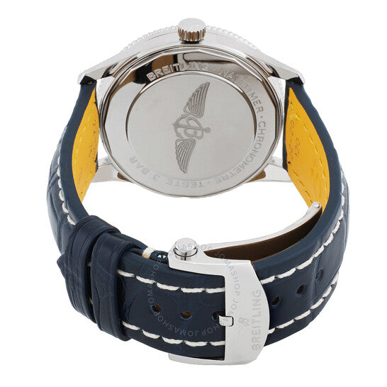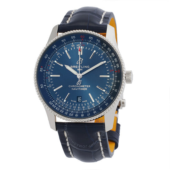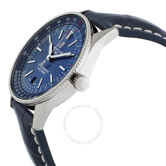علبة فضية اللون من الفولاذ المقاوم للصدأ مع سوار أزرق من جلد التمساح. إطار دوار أحادي الاتجاه من الفولاذ المقاوم للصدأ فضي اللون. ميناء أزرق مع عقارب فضية اللون وعلامات ساعات. مقياس نافيتايمر حول الحافة الخارجية. نوع الميناء: تناظري. عقارب مضيئة. عرض التاريخ عند موضع الساعة السادسة. حركة بريتلينغ كاليبر 17 أوتوماتيكية، مبنية على ETA 2824-2، تحتوي على 25 جوهرة، تنبض بمعدل 28800 ذبذبة في الساعة، ولديها احتياطي طاقة لمدة 42 ساعة تقريبًا. زجاج ياقوت مقاوم للخدش. تاج قابل للسحب/الدفع. غطاء خلفي صلب. شكل العلبة دائري، مقاسها: 41 مم، سمكها: 10.10 مم. مشبك بإبزيم قابل للفتح بزر ضغط. مقاومة للماء حتى عمق 30 مترًا / 100 قدم. الوظائف: التاريخ، الساعة، الدقيقة، الثانية، الكرونومتر. سلسلة نافيتايمر. تصميم ساعة فاخرة. ملصق الساعة: صناعة سويسرية. ساعة بريتلينج نافيتايمر أوتوماتيكية كرونومتر بمينا أزرق للرجال a17326161c1p4.