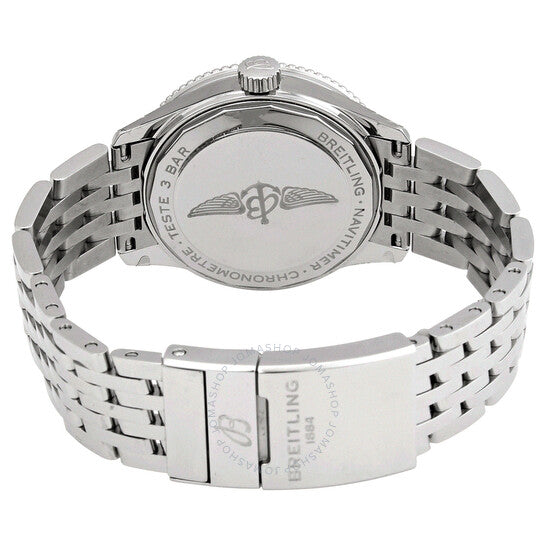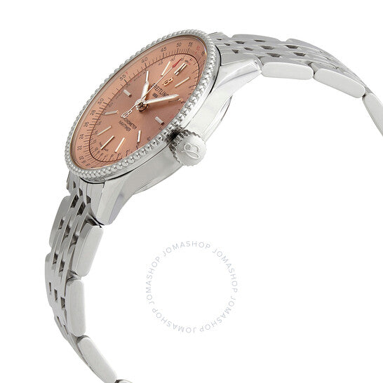 علبة من الفولاذ المقاوم للصدأ مع سوار من الفولاذ المقاوم للصدأ. إطار دوار أحادي الاتجاه من الفولاذ المقاوم للصدأ. ميناء نحاسي بعقارب فضية مضيئة وعلامات ساعات. مقياس تحويل ميل في الساعة/كيلومتر حول الحافة الخارجية. نوع الميناء: تناظري. عقارب مضيئة. حركة بريتلينغ أوتوماتيكية كاليبر 17، مبنية على ETA 2824-2، تحتوي على 25 جوهرة، تنبض بمعدل 28800 ذبذبة في الساعة، ولديها احتياطي طاقة لمدة 42 ساعة تقريبًا. زجاج ياقوت مقاوم للخدش. تاج لولبي. غطاء خلفي صلب. شكل دائري. حجم العلبة: 35 مم. سمكها: 10 مم. عرض السوار: 18 مم. مشبك قابل للطي. مقاومة للماء حتى عمق 30 مترًا / 100 قدم. الوظائف: التاريخ، الساعة، الدقيقة، الثانية، الكرونومتر. سلسلة نافيتايمر. تصميم ساعة فاخرة. علامة الساعة: صناعة سويسرية. ساعة بريتلينج نافيتايمر أوتوماتيكية كرونومتر كوبر دايل للسيدات A17395201K1A1.