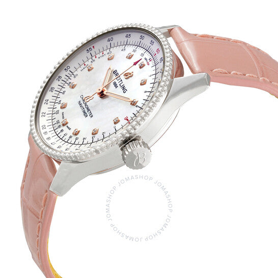 علبة فضية اللون من الفولاذ المقاوم للصدأ مع سوار جلدي وردي. إطار دوار ثنائي الاتجاه من الفولاذ المقاوم للصدأ فضي اللون. ميناء من عرق اللؤلؤ مع عقارب من الذهب الوردي وعلامات ساعات من الألماس. مقياس نافيتايمر حول الحافة الخارجية. نوع الميناء: تناظري. حركة بريتلينغ كاليبر 17 أوتوماتيكية، مبنية على ETA 2824-2، تحتوي على 25 جوهرة، تنبض بمعدل 28800 ذبذبة في الساعة، ولديها احتياطي طاقة لمدة 42 ساعة تقريبًا. زجاج من الياقوت المقاوم للخدش. تاج قابل للسحب/الدفع. غطاء خلفي صلب. شكل العلبة دائري، مقاس العلبة: 35 مم، سمكها: 9.9 مم. عرض السوار: 18 مم. مشبك قابل للطي. مقاومة للماء حتى عمق 30 مترًا / 100 قدم. الوظائف: الساعات، الدقائق، الثواني، الكرونومتر. سلسلة نافيتايمر. طراز ساعة رسمية. علامة الساعة: صناعة سويسرية. ساعة بريتلينغ نافيتايمر أوتوماتيكية كرونومتر مرصعة بالألماس للسيدات A17395211A1P4.