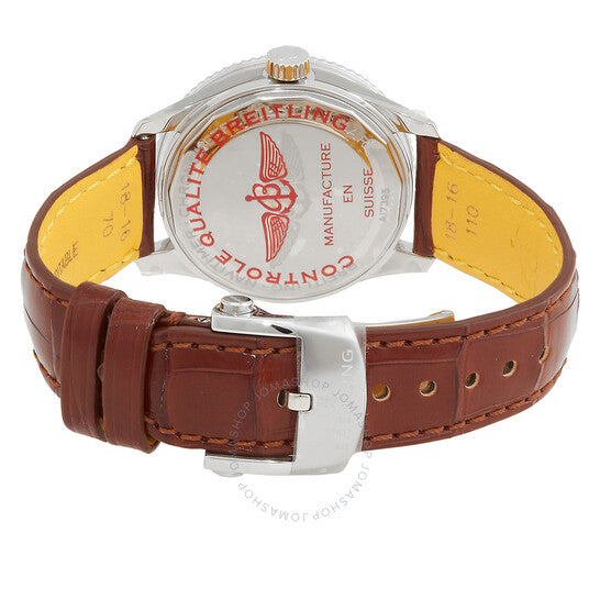 علبة من الفولاذ المقاوم للصدأ مع سوار من جلد التمساح البني. إطار دوار أحادي الاتجاه من الفولاذ المقاوم للصدأ. ميناء من النحاس مع عقارب مضيئة فضية اللون وعلامات ساعات. مقياس نافيتايمر حول الحافة الخارجية. نوع الميناء: تناظري. عقارب مضيئة. حركة بريتلينغ أوتوماتيكية كاليبر 17، مبنية على ETA 2824-2، تحتوي على 25 جوهرة، تنبض بمعدل 28800 ذبذبة في الساعة، ولديها احتياطي طاقة لمدة 42 ساعة تقريبًا. زجاج ياقوت مقاوم للخدش. تاج قابل للسحب/الدفع. غطاء خلفي صلب. شكل دائري. حجم العلبة: 35 مم. سمكها: 9.92 مم. عرض السوار: 18 مم / 16 مم. مشبك قابل للطي. مقاومة للماء حتى عمق 30 مترًا / 100 قدم. الوظائف: الساعات، الدقائق، الثواني، الكرونومتر. سلسلة نافيتايمر. تصميم ساعة فاخرة. علامة الساعة: سويسرية الصنع. ساعة بريتلينج نافيتايمر أوتوماتيكية كرونومتر للسيدات A17395201K1P2.