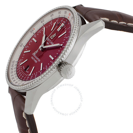 علبة فضية اللون من الفولاذ المقاوم للصدأ مع سوار بني من جلد التمساح. إطار دوار ثنائي الاتجاه من الفولاذ المقاوم للصدأ فضي اللون. ميناء أحمر بعقارب وعلامات ساعات فضية اللون. علامات دقائق حول الحافة الخارجية. نوع الميناء: تناظري. عقارب وعلامات مضيئة. عرض التاريخ عند موضع الساعة السادسة. حركة بريتلينغ كاليبر 17 أوتوماتيكية، مبنية على ETA 2824-2، تحتوي على 25 جوهرة، تنبض بمعدل 28800 ذبذبة في الساعة، ولديها احتياطي طاقة لمدة 42 ساعة تقريبًا. زجاج ياقوت مقاوم للخدش. تاج قابل للسحب/الدفع. غطاء خلفي صلب. شكل العلبة دائري، مقاسها: 41 مم، سمكها: 10 مم. مشبك قابل للطي بزر ضغط. مقاومة للماء حتى عمق 30 مترًا / 100 قدم. الوظائف: التاريخ، الساعة، الدقيقة، الثانية، الكرونومتر. سلسلة نافيتايمر. تصميم ساعة فاخرة. علامة الساعة: سويسرية الصنع. ساعة بريتلينج نافيتايمر أوتوماتيكية كرونومتر بمينا أحمر للرجال A173265A1K1P1.