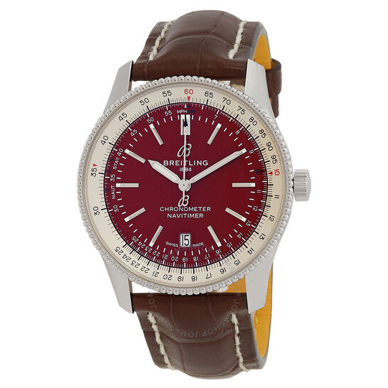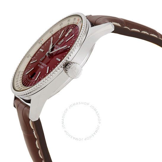 علبة فضية اللون من الفولاذ المقاوم للصدأ مع سوار جلدي بني. إطار دوار ثنائي الاتجاه من الفولاذ المقاوم للصدأ فضي اللون. ميناء أحمر بعقارب وعلامات ساعات فضية اللون. علامات دقائق حول الحافة الخارجية. نوع الميناء: تناظري. عقارب وعلامات مضيئة. عرض التاريخ عند موضع الساعة السادسة. حركة بريتلينغ كاليبر 17 أوتوماتيكية، مبنية على ETA 2824-2، تحتوي على 25 جوهرة، تنبض بمعدل 28800 ذبذبة في الساعة، ولديها احتياطي طاقة لمدة 42 ساعة تقريبًا. زجاج ياقوت مقاوم للخدش. تاج قابل للسحب/الدفع. غطاء خلفي صلب. شكل دائري، حجم العلبة: 41 مم، سمكها: 10 مم. مشبك تانغ. مقاومة للماء حتى عمق 30 مترًا / 100 قدم. الوظائف: التاريخ، الساعة، الدقائق، الثواني، الكرونومتر. سلسلة نافيتايمر. تصميم ساعة فاخرة. علامة الساعة: صناعة سويسرية. ساعة بريتلينج نافيتايمر أوتوماتيكية كرونومتر بمينا أحمر للرجال A173265A1K1P2.