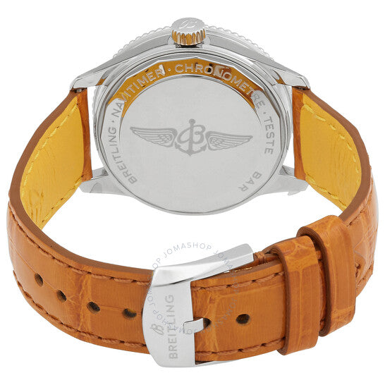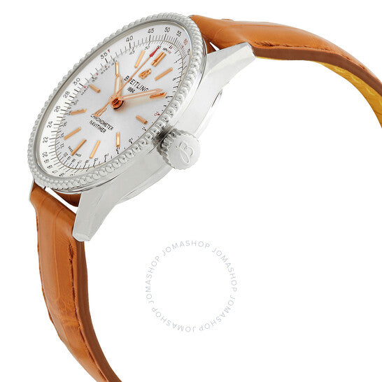 علبة فضية اللون من الفولاذ المقاوم للصدأ مع سوار من جلد التمساح بلون بني ذهبي. إطار دوار ثنائي الاتجاه من الفولاذ المقاوم للصدأ بلون فضي. ميناء فضي مع عقارب ومؤشرات ساعات بلون ذهبي وردي. مقياس نافيتايمر حول الحافة الخارجية. نوع الميناء: تناظري. عقارب مضيئة. حركة بريتلينغ كاليبر 17 أوتوماتيكية، مبنية على ETA 2824-2، تحتوي على 25 جوهرة، تنبض بمعدل 28800 ذبذبة في الساعة، ولديها احتياطي طاقة لمدة 42 ساعة تقريبًا. زجاج ياقوت مقاوم للخدش. تاج قابل للسحب/الدفع. غطاء خلفي صلب. شكل دائري، مقاس العلبة: 35 مم، سمكها: 9.9 مم. عرض السوار: 18/16 مم. مشبك تانغ. مقاومة للماء حتى عمق 30 مترًا / 100 قدم. الوظائف: التاريخ، الساعات، الدقائق، الثواني، الكرونومتر. سلسلة نافيتايمر. تصميم ساعة فاخرة. علامة الساعة: صناعة سويسرية. ساعة بريتلينج نافيتايمر أوتوماتيكية كرونومتر مينا فضية للسيدات A17395F41G1P3.