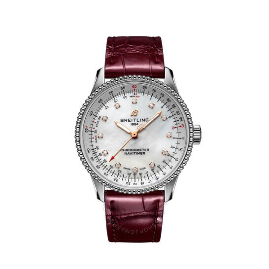 علبة فضية اللون من الفولاذ المقاوم للصدأ مع سوار جلدي عنابي. إطار دوار أحادي الاتجاه من الفولاذ المقاوم للصدأ فضي اللون. ميناء من عرق اللؤلؤ مع عقارب من الذهب الوردي وعلامات ساعات من الألماس. مقياس نافيتايمر حول الحافة الخارجية. نوع الميناء: تناظري. عقارب مضيئة. حركة بريتلينغ كاليبر 17 أوتوماتيكية، مبنية على ETA 2824-2، تحتوي على 25 جوهرة، تنبض بسرعة 28800 ذبذبة في الساعة، ولديها احتياطي طاقة لمدة 42 ساعة تقريبًا. زجاج من الياقوت المقاوم للخدش. تاج قابل للسحب/الدفع. غطاء خلفي صلب. شكل دائري، حجم العلبة: 35 مم، سمكها: 10 مم. مشبك بإبزيم. مقاومة للماء حتى عمق 30 مترًا / 100 قدم. الوظائف: الساعات، الدقائق، الثواني، الكرونومتر. سلسلة نافيتايمر. طراز ساعة رسمية. علامة الساعة: صناعة سويسرية. ساعة بريتلينغ نافيتايمر أوتوماتيكية نسائية مرصعة بالألماس A17395211A1P1.