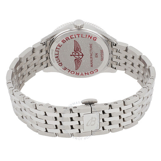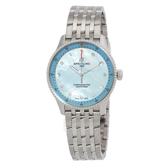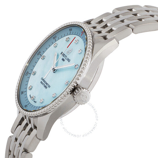 علبة وسوار من الفولاذ المقاوم للصدأ فضي اللون. إطار ثابت من الفولاذ المقاوم للصدأ فضي اللون. ميناء بلون فاتح من عرق اللؤلؤ مع عقارب فضية اللون وعلامات ساعات من الألماس. علامات دقائق حول الحافة الخارجية. نوع الميناء: تناظري. عقارب مضيئة. حركة كوارتز بريتلينغ كاليبر 77. زجاج ياقوت مقاوم للخدش. تاج قابل للسحب/الدفع. غطاء خلفي صلب. شكل العلبة دائري، مقاسها: 32 مم، سمكها: 8 مم. عرض السوار: 16 مم. مشبك قابل للطي. مقاومة للماء حتى عمق 50 مترًا / 165 قدمًا. الوظائف: الساعات، الدقائق، الثواني، الكرونومتر. سلسلة نافيتايمر. تصميم كاجوال. علامة الساعة: صناعة سويسرية. ساعة بريتلينغ نافيتايمر كوارتز كرونومتر مرصعة بالألماس للسيدات A77320171C1A1.