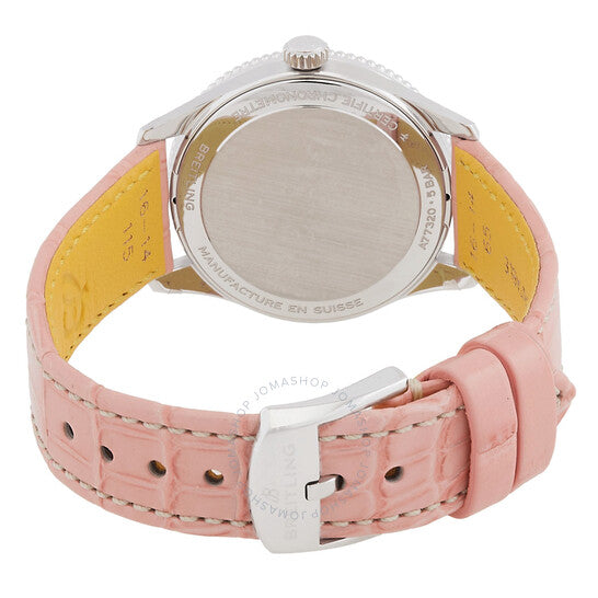 علبة فضية اللون من الفولاذ المقاوم للصدأ مع سوار وردي من جلد التمساح. إطار دوار ثنائي الاتجاه من الفولاذ المقاوم للصدأ فضي اللون. ميناء وردي من عرق اللؤلؤ مع عقارب فضية اللون وعلامات ساعات من الألماس. مقياس دقائق حول الحافة الداخلية. نوع الميناء: تناظري. عقارب مضيئة. حركة كوارتز بريتلينغ كاليبر 77. زجاج ياقوت مقاوم للخدش. تاج قابل للسحب/الدفع. غطاء خلفي صلب. شكل العلبة دائري، مقاسها: 32 مم، سمكها: 8 مم. مشبك تانغ. مقاومة للماء حتى عمق 50 مترًا / 165 قدمًا. الوظائف: الساعات، الدقائق، الثواني. سلسلة نافيتايمر. طراز الساعة الرياضية. علامة الساعة: صناعة سويسرية. ساعة بريتلينغ نافيتايمر كوارتز نسائية مرصعة بالألماس A77320D91K1P1.