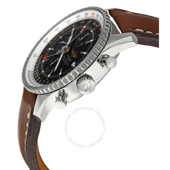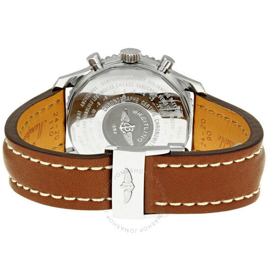 علبة من الفولاذ المقاوم للصدأ مع سوار جلدي بني بخياطة متباينة. إطار ثنائي الاتجاه من الفولاذ المقاوم للصدأ. ميناء أسود بعقارب مضيئة وعلامات ساعات. علامات دقائق ومقياس تحويل كيلومترات/أميال/أميال بحرية حول الحافة الخارجية. عقارب وعلامات مضيئة. يعرض التاريخ عند موضع الساعة 3. كرونوغراف - ثلاثة أقراص فرعية تعرض: 12 ساعة، 30 دقيقة، و60 ثانية. حركة ميكانيكية ذاتية التعبئة. كريستال ياقوت مقاوم للخدش. تاج مقفل بدون براغي مع حشيتين. غطاء خلفي مثبت ببراغي. قطر العلبة: 46 مم. سمكها: 15.50 مم. مشبك قابل للطي. مقاومة للماء حتى عمق 30 مترًا/100 قدم. الوظائف: الساعات، الدقائق، الثواني، التاريخ، الكرونوغراف. ساعة بريتلينغ نافيتايمر وورلد كرونوغراف للرجال A2432212-B726BRLD.