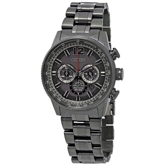 علبة وسوار من الفولاذ المقاوم للصدأ مطليان بالأيونات من الجرانيت. إطار ثابت مطلي بالأيونات من الجرانيت. ميناء رمادي فحمي مع عقارب سوداء مضيئة وعلامات ساعات. يظهر رقم عربي عند موضع الساعة 12. علامات الدقائق. علامات تاكيميتر حول الحافة الخارجية. نوع الميناء: تناظري. عقارب وعلامات مضيئة. عرض التاريخ بين موضعي الساعة 4 و5. كرونوغراف - ثلاثة أقراص فرعية تعرض: 60 ثانية، 60 دقيقة، و24 ساعة. حركة كوارتز سيتيزن كاليبر إيكو-درايف B620. زجاج معدني مقاوم للخدش. تاج لولبي. غطاء خلفي صلب. شكل دائري. حجم الهيكل: 43 مم. سمك الهيكل: 12.5 مم. عرض السوار: 23 مم. مشبك قابل للطي بزر ضغط. مقاومة للماء حتى عمق 200 متر / 660 قدمًا. الوظائف: كرونوغراف، تاريخ، ساعة، دقيقة، ثانية. تصميم ساعة كاجوال. ملصق الساعة: Japan Movt. ساعة سيتيزن نايت هوك كرونوغراف بمينا رمادي فحمي للرجال CA4377-53H.