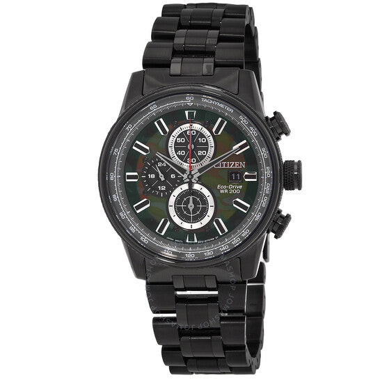 علبة وسوار من الفولاذ المقاوم للصدأ باللون الأسود. إطار ثابت من الفولاذ المقاوم للصدأ باللون الأسود. ميناء أخضر مموه بعقارب وعلامات ساعات فضية اللون. علامات دقائق حول الحافة الخارجية. نوع الميناء: تناظري. عقارب وعلامات مضيئة. عرض التاريخ عند موضع الساعة 3. كرونوغراف - ثلاثة موانئ فرعية تعرض: 60 ثانية، 60 دقيقة، و24 ساعة. حركة Citizen Caliber Eco-Drive B612 eco-drive. زجاج معدني مقاوم للخدش. تاج لولبي. غطاء خلفي صلب. شكل دائري، مقاس العلبة: 43 مم. عرض السوار: 22 مم. مشبك قابل للطي مع مفتاح أمان. مقاومة للماء حتى عمق 200 متر / 660 قدم. الوظائف: كرونوغراف، تاريخ، ساعة، دقيقة، ثانية، تعمل بالطاقة الشمسية. سلسلة نايت هوك. طراز ساعة رياضية. ملصق الساعة: Japan Movt. ساعة Citizen Nighthawk كرونوغراف رجالية بمينا مموهة باللون الأخضر CA0805-53X.