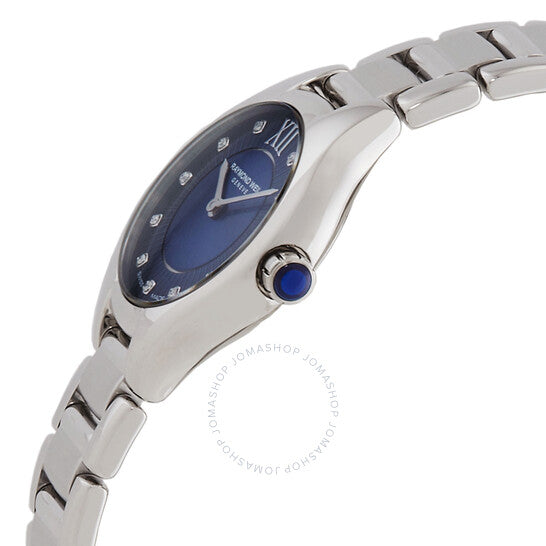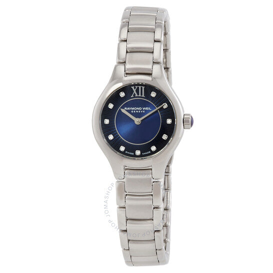 علبة وسوار من الفولاذ المقاوم للصدأ فضي اللون. إطار ثابت من الفولاذ المقاوم للصدأ فضي اللون. ميناء أزرق بعقارب فضية اللون وعلامات ساعات من الألماس. أرقام رومانية تشير إلى موضع الساعة ١٢. نوع الميناء: تناظري. حركة كوارتز. زجاج ياقوت مقاوم للخدش. تاج قابل للسحب/الدفع. غطاء خلفي صلب. شكل دائري، مقاس العلبة: ٢٤ مم، سمكها: ٧ مم. مشبك قابل للطي مع مفتاح أمان. مقاومة للماء حتى عمق ٥٠ مترًا / ١٦٥ قدمًا. الوظائف: الساعات، الدقائق، الثواني. سلسلة نويميا. تصميم ساعة فاخرة. علامة الساعة: صناعة سويسرية. ساعة ريموند ويل نويميا كوارتز نسائية بمينا زرقاء مرصعة بالألماس، رقمها ٥١٢٤-ST-٥٠١٨١.