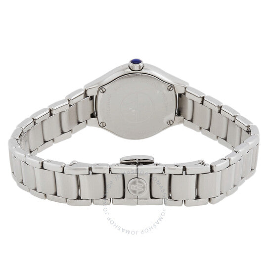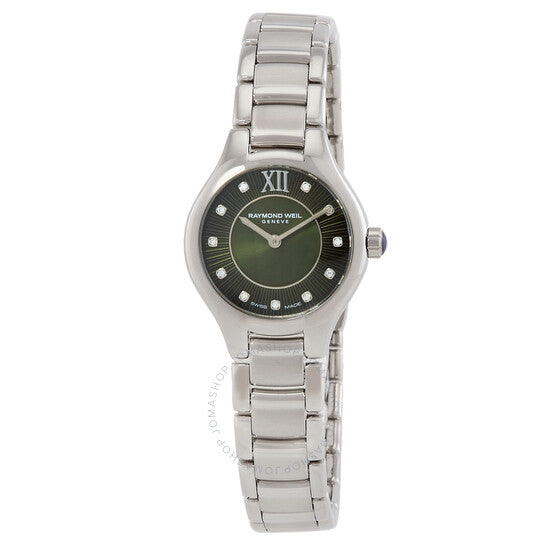 علبة وسوار من الفولاذ المقاوم للصدأ فضي اللون. إطار ثابت من الفولاذ المقاوم للصدأ فضي اللون. ميناء أخضر بعقارب فضية اللون وعلامات ساعات من الألماس. أرقام رومانية تُشير إلى موضع الساعة ١٢. نوع الميناء: تناظري. حركة كوارتز. زجاج ياقوت مقاوم للخدش. تاج قابل للسحب/الدفع. غطاء خلفي صلب. شكل دائري، مقاس العلبة: ٢٤ مم، سمكها: ٧ مم. مشبك قابل للطي مع مفتاح أمان. مقاومة للماء حتى عمق ٥٠ مترًا / ١٦٥ قدمًا. الوظائف: الساعات، الدقائق، الثواني. سلسلة نويميا. تصميم ساعة فاخرة. علامة الساعة: صناعة سويسرية. ساعة ريموند ويل نويميا كوارتز نسائية بمينا خضراء مرصعة بالألماس، رقمها ٥١٢٤-ST-٥٢١٨١.