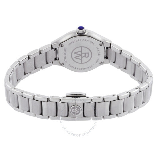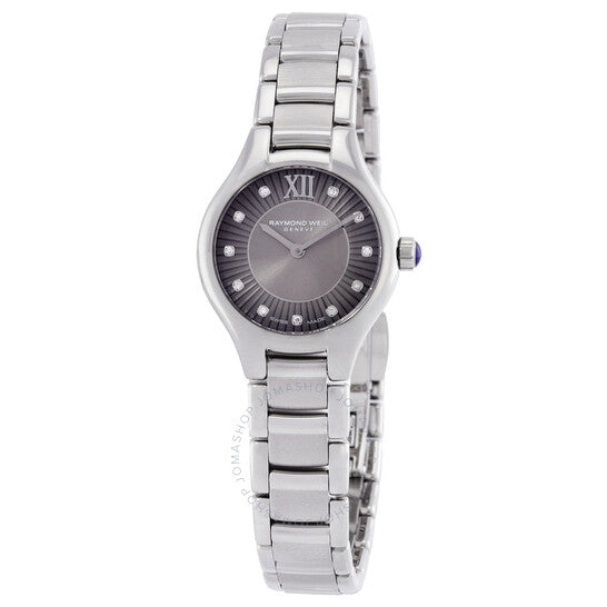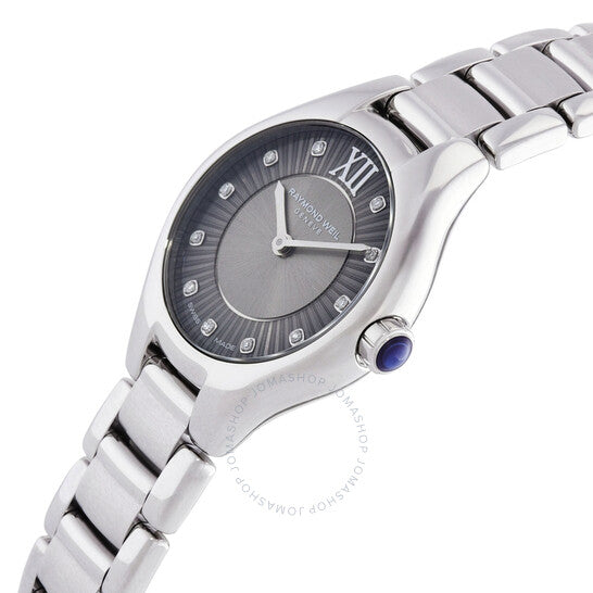 علبة وسوار من الفولاذ المقاوم للصدأ فضي اللون. إطار ثابت من الفولاذ المقاوم للصدأ فضي اللون. ميناء رمادي بعقارب فضية اللون وعلامات ساعات من الألماس. أرقام رومانية تشير إلى موضع الساعة ١٢. نوع الميناء: تناظري. حركة كوارتز. زجاج ياقوت مقاوم للخدش. تاج قابل للسحب/الدفع. غطاء خلفي صلب. شكل دائري، مقاس العلبة: ٢٤ مم، سمكها: ٧ مم. مشبك قابل للطي مع مفتاح أمان. مقاومة للماء حتى عمق ٥٠ مترًا / ١٦٥ قدمًا. الوظائف: الساعات، الدقائق، الثواني. سلسلة نويميا. تصميم ساعة فاخرة. علامة الساعة: صناعة سويسرية. ساعة ريموند ويل نويميا كوارتز نسائية بمينا رمادي مرصعة بالألماس، رقمها ٥١٢٤-ST-٦٠١٨١.