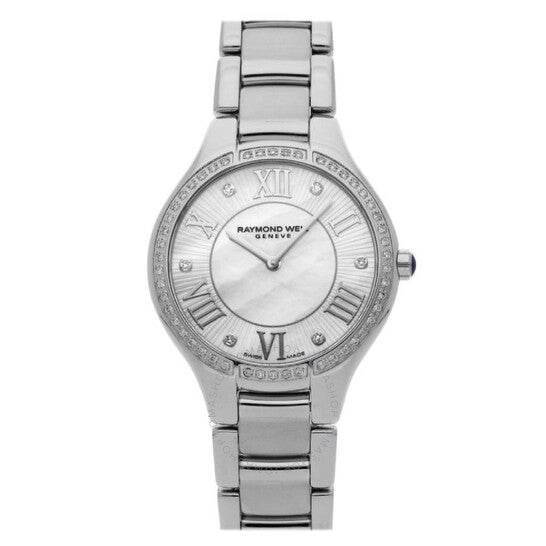 علبة وسوار من الفولاذ المقاوم للصدأ فضي اللون. إطار ثابت فضي اللون مرصع بالألماس من الفولاذ المقاوم للصدأ. ميناء من عرق اللؤلؤ مع عقارب فضية اللون وعلامات ساعات من الألماس. نوع الميناء: تناظري. حركة كوارتز. زجاج ياقوت مقاوم للخدش. علبة دائرية الشكل، مقاسها: ٣٢ مم. مشبك قابل للطي مع قفل أمان. الوظائف: الساعات، الدقائق. سلسلة نويميا. طراز ساعة رسمية. علامة الساعة: صناعة سويسرية. ساعة ريموند ويل نويميا كوارتز نسائية مرصعة بالألماس رقم ٥١٣٢-S٢S-٠٠٩٦٦.