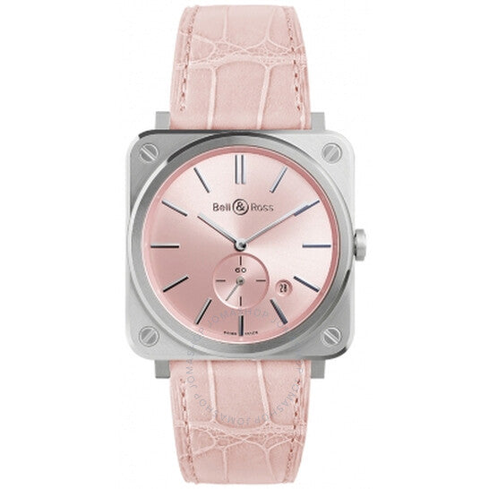 علبة من الفولاذ المقاوم للصدأ فضية اللون مع سوار وردي من جلد التمساح. إطار ثابت من الفولاذ المقاوم للصدأ فضي اللون. ميناء وردي مع عقارب فضية اللون وعلامات ساعات. نوع الميناء: تناظري. عرض التاريخ بين موضعي الساعة 4 و5. ميناء فرعي للثواني الصغيرة. آلية حركة كوارتز. زجاج من الياقوت المقاوم للخدش. تاج قابل للسحب/الدفع. غطاء خلفي صلب. شكل العلبة مربع. حجم العلبة: 39 مم. مشبك بإبزيم دبوسي. مقاومة للماء حتى عمق 100 متر / 330 قدمًا. الوظائف: التاريخ، الساعة، الدقائق، الثواني الصغيرة. تصميم ساعة فاخرة. علامة الساعة: صناعة سويسرية. ساعة بيل آند روس نوفاروزا كوارتز نسائية بمينا وردي، BRS-PK-ST/SCR.
