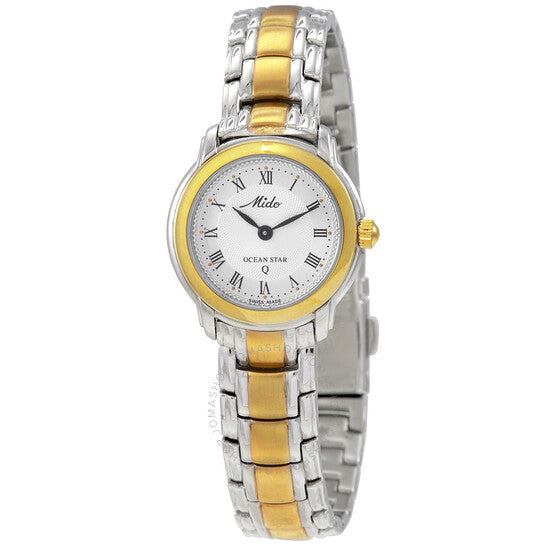 علبة من الفولاذ المقاوم للصدأ بسوار من الفولاذ المقاوم للصدأ ثنائي اللون (فضي وذهبي أصفر). إطار ثابت من الذهب الأصفر. ميناء أبيض بعقارب سوداء وعلامات ساعات رومانية. علامات دقائق حول الحافة الخارجية. نوع الميناء: تناظري. حركة كوارتز. زجاج ياقوت مقاوم للخدش. تاج قابل للسحب/الدفع. غطاء خلفي صلب. شكل دائري، مقاس العلبة: ٢٤ مم. مشبك قابل للطي بزر ضغط. مقاومة للماء حتى عمق ٣٠ مترًا / ١٠٠ قدم. الوظائف: ساعة، دقيقة. سلسلة أوشن ستار. تصميم كاجوال. علامة الساعة: صناعة سويسرية. ساعة ميدو أوشن ستار كوارتز نسائية بمينا بيضاء M74409211.