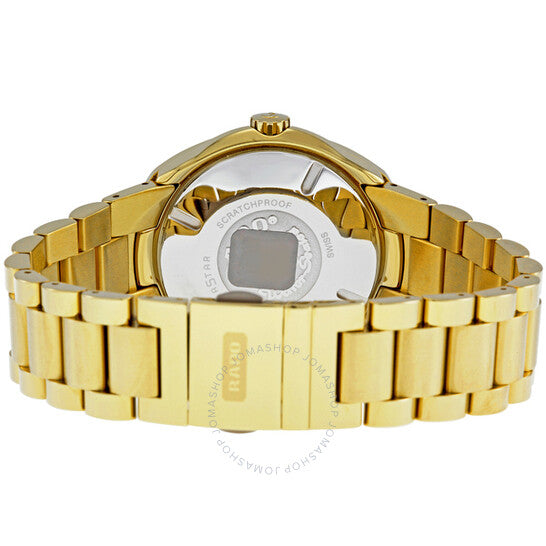 علبة من الفولاذ المقاوم للصدأ بلون ذهبي مع سوار من الفولاذ المقاوم للصدأ بلون ذهبي. إطار ذهبي ثابت. ميناء ذهبي بنقشة أشعة الشمس مع عقارب مضيئة ذهبية اللون وعلامات ساعات لاصقة. علامات دقائق حول الحافة الخارجية. نوع الميناء: تناظري. عقارب مضيئة. يظهر عرض التاريخ عند موضع الساعة الرابعة. حركة أوتوماتيكية. محرك ETA 2824-2. كريستال ياقوتي مقاوم للخدش. تاج لولبي. غطاء خلفي صلب. قطر العلبة: 35.1 مم. سمكها: 13.7 مم. عرض السوار: 21 مم. طول السوار: 8 بوصات. مشبك قابل للطي بزر ضغط. مقاومة للماء حتى عمق 100 متر / 330 قدمًا. الوظائف: التاريخ، الساعة، الدقائق، الثواني. تصميم كاجوال. ساعة رادو الأصلية الأوتوماتيكية باللون الذهبي R12950253.