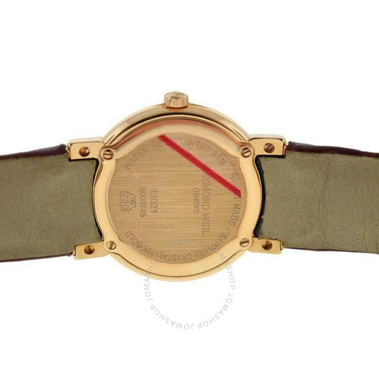 علبة من الذهب الأصفر عيار 18 قيراطًا، مع سوار جلدي بني. إطار ثابت من الذهب الأصفر مرصع بالألماس. ميناء بني مع عقارب من الذهب الأصفر وعلامات ساعات رومانية. نوع الميناء: تناظري. حركة كوارتز. زجاج ياقوت مقاوم للخدش. غطاء خلفي صلب. شكل دائري، مقاس العلبة: 28 مم. مشبك بإبزيم. مقاومة للماء حتى عمق 30 مترًا / 100 قدم. الوظائف: الساعات، الدقائق. سلسلة عطيل. طراز ساعة رسمية. علامة الساعة: صناعة سويسرية. ساعة ريموند ويل عطيل كوارتز نسائية بمينا بني مرصعة بالألماس، 12021-GS-00480.