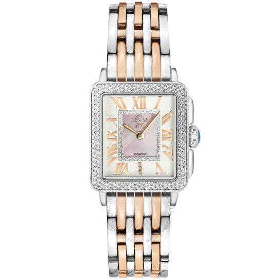 علبة من الفولاذ المقاوم للصدأ مع سوار من الفولاذ المقاوم للصدأ ثنائي اللون (فضي وذهبي وردي). إطار ثابت من الفولاذ المقاوم للصدأ (مقطع بالألماس). ميناء أبيض مع عقارب على شكل سيف بلون ذهبي وردي وعلامات ساعات بأرقام رومانية. علامات مؤشر مرصعة بالألماس عند موضع الساعة 6. نوع الميناء: تناظري. حركة كوارتز. زجاج ياقوت مقاوم للخدش. تاج قابل للسحب/الدفع. غطاء خلفي صلب. شكل العلبة مربع. حجم العلبة: 28.5 مم. مشبك قابل للطي بزر ضغط. مقاومة للماء حتى عمق 30 مترًا / 100 قدم. الوظائف: الساعات، الدقائق. سلسلة بادوفا. ساعة أنيقة. ساعة GV2 من جيفريل بادوفا كوارتز نسائية بمينا بيضاء مرصعة بالألماس، 12302B.