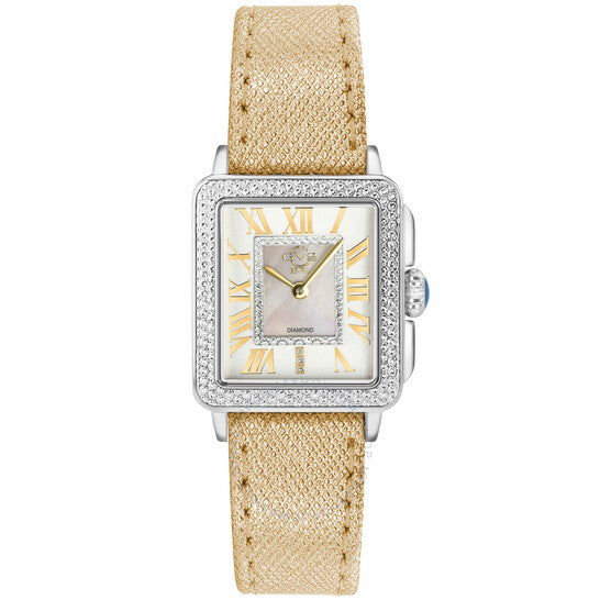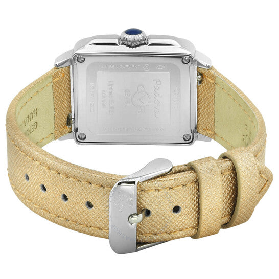 علبة من الفولاذ المقاوم للصدأ مع سوار من جلد سافيانو بلون بني فاتح. إطار ثابت من الفولاذ المقاوم للصدأ (مقصوص بالألماس). ميناء أبيض (مرصع بالألماس) بعقارب ذهبية اللون على شكل سيف وعلامات ساعات رومانية. مؤشر مرصع بالألماس عند موضع الساعة السادسة. نوع الميناء: تناظري. حركة كوارتز. زجاج ياقوت مقاوم للخدش. تاج قابل للسحب/الدفع. غطاء خلفي صلب. شكل مربع. حجم العلبة: ٢٨.٥ مم. سمكها: ٩.٥ مم. عرض السوار: ١٨ مم. مشبك تانغ. مقاومة للماء حتى عمق ٣٠ مترًا / ١٠٠ قدم. الوظائف: الساعات، الدقائق. سلسلة بادوفا. تصميم عصري. علامة الساعة: صناعة سويسرية. ساعة GV2 من جيفريل بادوفا كوارتز نسائية بمينا بيضاء مرصعة بالألماس، ١٢٣٠٤.
