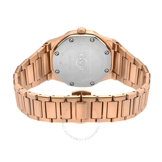 علبة وسوار من الفولاذ المقاوم للصدأ بلون الذهب الوردي. إطار ثابت من الذهب الوردي بقطع ماسي. ميناء أسود مع عقارب مضيئة على شكل مؤشر وعلامات ساعات. مؤشر مرصع بالماس عند موضع الساعة ١٢. علامات دقائق حول الحافة الخارجية. نوع الميناء: تناظري. عقارب وعلامات مضيئة. عرض التاريخ فوق موضع الساعة ٦. حركة كوارتز. زجاج ياقوت مقاوم للخدش. تاج قابل للسحب/الدفع. غطاء خلفي صلب. شكل العلبة: تونيو. حجم العلبة: ٣٣ مم. سمكها: ٨ مم. عرض السوار: ١٤ مم. مشبك قابل للطي بزر ضغط. مقاومة للماء حتى عمق ٥٠ مترًا / ١٦٥ قدمًا. الوظائف: التاريخ، الساعة، الدقائق. سلسلة بالمانوفا. تصميم عصري. علامة الساعة: صناعة سويسرية. ساعة GV2 من جيفريل بالمانوفا كوارتز نسائية بمينا سوداء مرصعة بالألماس، ١٢٧٠٤.