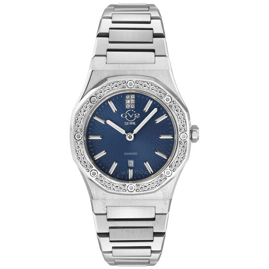 علبة من الفولاذ المقاوم للصدأ مع سوار من الفولاذ المقاوم للصدأ. إطار ثابت (مُقطع بالماس) من الفولاذ المقاوم للصدأ. ميناء أزرق مع عقارب فضية اللون وعلامات ساعات. يظهر مؤشر مرصع بالماس عند موضع الساعة ١٢. علامات دقائق حول الحافة الخارجية. نوع الميناء: تناظري. عقارب وعلامات مضيئة. عرض التاريخ أعلى موضع الساعة ٦. حركة كوارتز. زجاج ياقوت مقاوم للخدش. تاج قابل للسحب/الدفع. غطاء خلفي صلب. شكل العلبة: تونيو. حجم العلبة: ٣٣ مم. سمكها: ٨ مم. عرض السوار: ١٤ مم. مشبك قابل للطي بزر ضغط. مقاومة للماء حتى عمق ٥٠ مترًا / ١٦٥ قدمًا. الوظائف: التاريخ، الساعة، الدقائق. سلسلة بالمانوفا. تصميم عصري. علامة الساعة: صناعة سويسرية. ساعة GV2 من جيفريل بالمانوفا كوارتز نسائية بمينا زرقاء مرصعة بالألماس، ١٢٧٠٣.