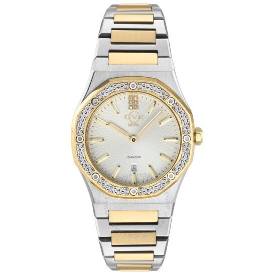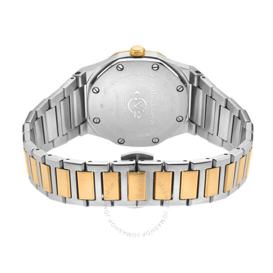 علبة فضية اللون من الفولاذ المقاوم للصدأ مع سوار من الفولاذ المقاوم للصدأ ثنائي اللون (فضي وذهبي أصفر). إطار ثابت من الفولاذ المقاوم للصدأ ذهبي اللون. ميناء أبيض مع عقارب وعلامات ساعات ذهبية مضيئة. مؤشر مرصع بالألماس عند موضع الساعة ١٢. علامات دقائق حول الحافة الخارجية. نوع الميناء: تناظري. عقارب وعلامات مضيئة. عرض التاريخ أعلى موضع الساعة ٦. حركة كوارتز. زجاج ياقوت مقاوم للخدش. تاج قابل للسحب/الدفع. غطاء خلفي صلب. شكل العلبة مثمن، حجم العلبة: ٣٣ مم، سمكها: ٨ مم. عرض السوار: ١٤ مم. مشبك قابل للطي بزر ضغط. مقاومة للماء حتى عمق ٥٠ مترًا / ١٦٥ قدمًا. الوظائف: التاريخ، الساعة، الدقائق. سلسلة بالمانوفا. تصميم عصري. علامة الساعة: صناعة سويسرية. ساعة GV2 من جيفريل بالمانوفا كوارتز نسائية بمينا بيضاء مرصعة بالألماس ١٢٧٠٠.