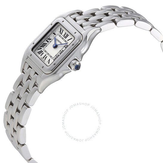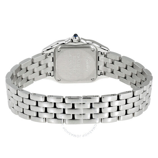 علبة من الفولاذ المقاوم للصدأ مع سوار من الفولاذ المقاوم للصدأ. إطار ثابت من الفولاذ المقاوم للصدأ. ميناء فضي بعقارب زرقاء وعلامات ساعات رومانية. علامات دقائق حول حلقة داخلية. نوع الميناء: تناظري. حركة كوارتز. زجاج ياقوت مقاوم للخدش. تاج سحب/دفع مرصع بحجر سبينل أزرق صناعي. ظهر صلب. شكل العلبة مربع. أبعاد العلبة: ٢٣ مم × ٣٠ مم. سمك العلبة: ٦ مم. عرض السوار: ١٢ مم. مشبك طي مخفي. مقاومة للماء حتى عمق ٣٠ مترًا / ١٠٠ قدم. الوظائف: الساعات، الدقائق. معلومات إضافية: تاج مرصع بحجر سبينل أزرق صناعي. طراز ساعة رسمية. علامة الساعة: صناعة سويسرية. ساعة كارتييه بانتير دو كارتييه النسائية بمينا فضي WSPN0006.