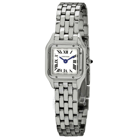 علبة من الفولاذ المقاوم للصدأ مع سوار من الفولاذ المقاوم للصدأ. إطار ثابت من الفولاذ المقاوم للصدأ. ميناء فضي بعقارب زرقاء وعلامات ساعات بأرقام رومانية. نوع الميناء: تناظري. حركة كوارتز. زجاج ياقوت مقاوم للخدش. تاج سحب/دفع مرصع بحجر سبينل صناعي أزرق. غطاء خلفي صلب. شكل العلبة مربع. أبعاد العلبة: ٢٥ مم × ٢١ مم. سمكها: ٦ مم. مشبك طي مخفي. مقاومة للماء حتى عمق ٣٠ مترًا / ١٠٠ قدم. الوظائف: الساعات، الدقائق. معلومات إضافية: تاج مرصع بحجر سبينل صناعي أزرق. طراز ساعة فاخرة. علامة الساعة: صناعة سويسرية. ساعة كارتييه بانثير ميني بمينا فضية نسائية WSPN0019.