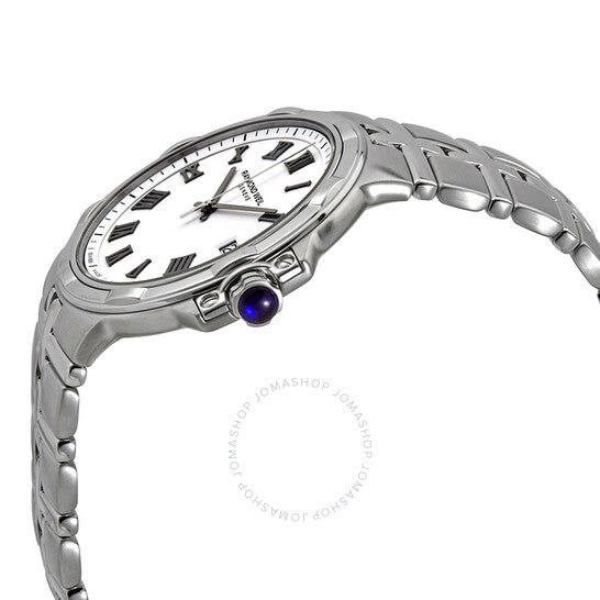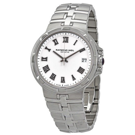 علبة من الفولاذ المقاوم للصدأ مع سوار من الفولاذ المقاوم للصدأ. إطار ثابت من الفولاذ المقاوم للصدأ. ميناء أبيض بعقارب سوداء وعلامات ساعات رومانية. علامات دقائق حول الحافة الخارجية. نوع الميناء: تناظري. عرض التاريخ عند موضع الساعة 3. آلية حركة كوارتز. زجاج ياقوت مقاوم للخدش. تاج قابل للسحب/الدفع. غطاء خلفي صلب. شكل دائري. حجم العلبة: 41 مم. سمكها: 6.75 مم. عرض السوار: 22 مم. مشبك قابل للطي مع مفتاح أمان مزدوج. مقاومة للماء حتى عمق 50 مترًا / 165 قدمًا. الوظائف: التاريخ، الساعة، الدقائق، الثواني. طراز ساعة رسمية. علامة الساعة: صناعة سويسرية. ساعة ريموند ويل بارسيفال للرجال بمينا أبيض 5580-ST-00300.