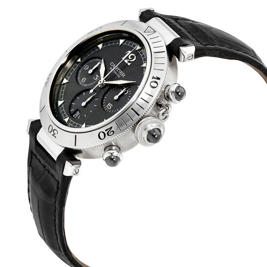 علبة من الفولاذ المقاوم للصدأ مع سوار أسود من جلد التمساح. إطار بلاتيني دوار أحادي الاتجاه. ميناء رمادي اللون مع عقارب فضية اللون وعلامات ساعات. يظهر رقم عربي عند موضع الساعة ١٢. علامات دقائق حول الحافة الخارجية. نوع الميناء: تناظري. عرض التاريخ عند موضع الساعة ٦. كرونوغراف - ثلاثة أقراص فرعية تعرض: ٦٠ ثانية، ٣٠ دقيقة، و١٢ ساعة. حركة أوتوماتيكية. زجاج ياقوت مقاوم للخدش. غطاء خلفي شفاف. حجم العلبة: ٣٨ مم. سُمكها: ١١ مم. شكلها دائري. مشبك قابل للطي. مقاومة للماء حتى عمق ٣٠ مترًا / ١٠٠ قدم. طراز ساعة فاخرة. علامة الساعة: صناعة سويسرية. ساعة كارتييه باشا أوتوماتيكية كرونوغراف نسائية بمينا رمادي W3107355.