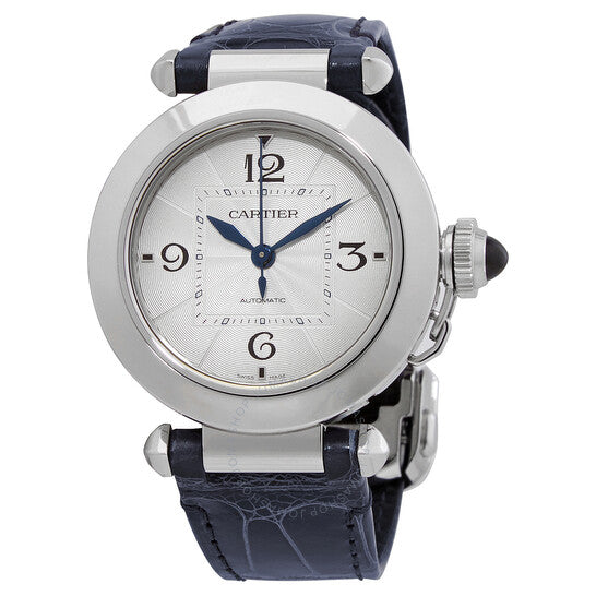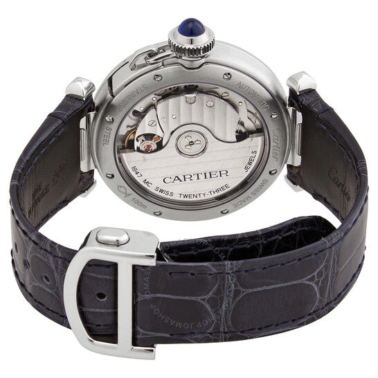 علبة من الفولاذ المقاوم للصدأ مع سوار أزرق من جلد التمساح. إطار ثابت من الفولاذ المقاوم للصدأ. ميناء فضي بعقارب زرقاء وعلامات ساعات. تظهر الأرقام العربية عند مواضع الساعة 3 و6 و9 و12. علامات الدقائق حول حلقة داخلية. نوع الميناء: تناظري. حركة أوتوماتيكية من كارتييه عيار 1847 MC، تحتوي على 23 جوهرة، تنبض بتردد 28800 ذبذبة في الساعة، ولديها احتياطي طاقة لمدة 42 ساعة تقريبًا. زجاج من الياقوت المقاوم للخدش. تاج لولبي مرصع بأحجار سبينيل صناعية. غطاء خلفي شفاف. شكل دائري. حجم العلبة: 35 مم. سمكها: 9.37 مم. مشبك قابل للطي. مقاومة للماء حتى عمق 100 متر / 330 قدمًا. الوظائف: التاريخ، الساعة، الدقيقة، الثانية. سلسلة باشا. تصميم ساعة فاخرة. علامة الساعة: صناعة سويسرية. ساعة كارتييه باشا أوتوماتيكية بمينا فضي وجلد أسود WSPA0012.