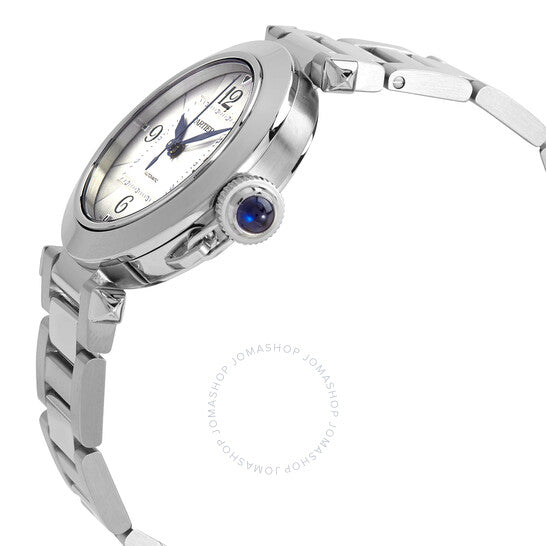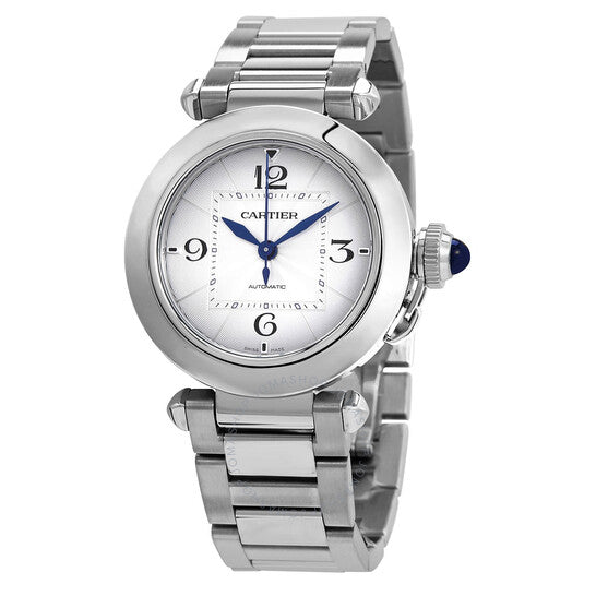 علبة وسوار من الفولاذ المقاوم للصدأ فضي اللون. إطار ثابت من الفولاذ المقاوم للصدأ فضي اللون. ميناء فضي بعقارب زرقاء وعلامات ساعات. تظهر أرقام عربية عند مواضع الساعات 3 و6 و9 و12. علامات دقائق حول حلقة داخلية. نوع الميناء: تناظري. علامات مضيئة. حركة كارتييه كاليبر 1847 إم سي أوتوماتيكية، تحتوي على 23 جوهرة، تنبض بتردد 28800 ذبذبة في الساعة، ولديها احتياطي طاقة لمدة 42 ساعة تقريبًا. زجاج من الياقوت المقاوم للخدش. تاج لولبي. غطاء خلفي شفاف. شكل دائري، مقاس العلبة: 35 مم، سمكها: 9.37 مم. مشبك قابل للطي. مقاومة للماء حتى عمق 100 متر / 330 قدمًا. الوظائف: الساعة، الدقيقة، الثانية. سلسلة باشا. تصميم ساعة فاخرة. علامة الساعة: صناعة سويسرية. ساعة كارتييه باشا أوتوماتيكية نسائية بمينا فضي WSPA0013.