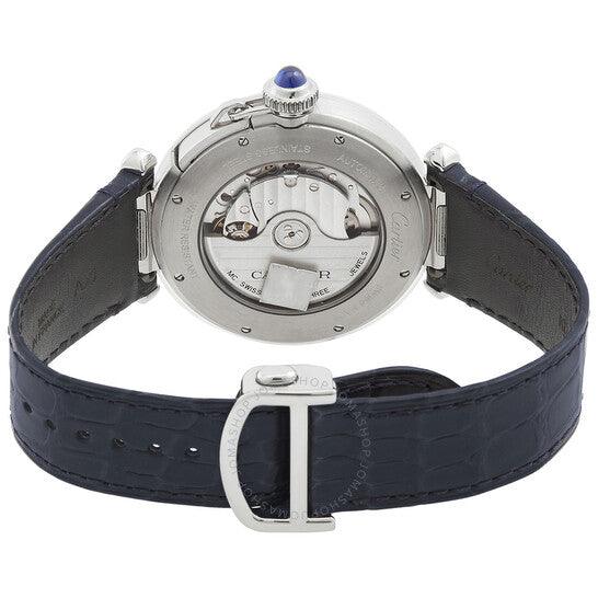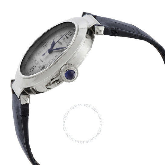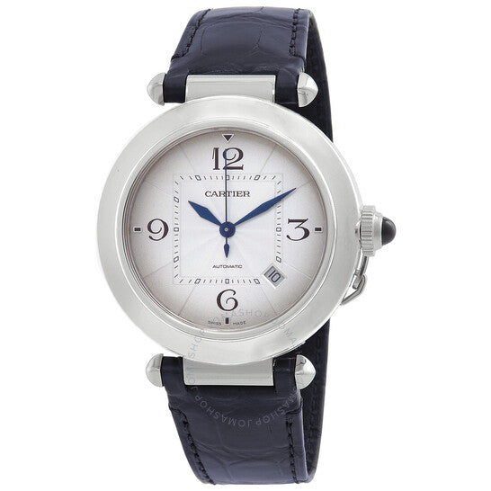 علبة من الفولاذ المقاوم للصدأ مع حزام أزرق من جلد التمساح. إطار ثابت من الفولاذ المقاوم للصدأ. ميناء فضي بعقارب زرقاء وعلامات ساعات. تظهر الأرقام العربية عند الساعة 3 و6 و9 و12. علامات الدقائق حول حلقة داخلية. نوع الميناء: تناظري. عرض التاريخ بين الساعة 4 و5. حركة أوتوماتيكية من كارتييه عيار 1847 MC، تحتوي على 23 جوهرة، تنبض بمعدل 28800 ذبذبة في الساعة، ولديها احتياطي طاقة لمدة 42 ساعة تقريبًا. زجاج من الياقوت المقاوم للخدش. تاج لولبي. غطاء خلفي شفاف. شكل دائري. حجم العلبة: 41 مم. سمك العلبة: 9.55 مم. عرض السوار: 22 مم. مقاومة للماء حتى عمق 100 متر / 330 قدمًا. الوظائف: التاريخ، الساعة، الدقيقة، الثانية. سلسلة باشا. تصميم ساعة فاخرة. علامة الساعة: صناعة سويسرية. ساعة كارتييه باشا أوتوماتيكية للرجال بمينا فضي WSPA0010.