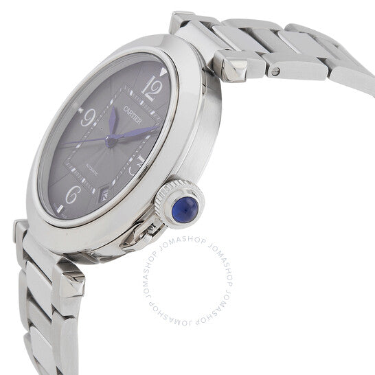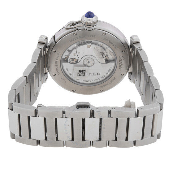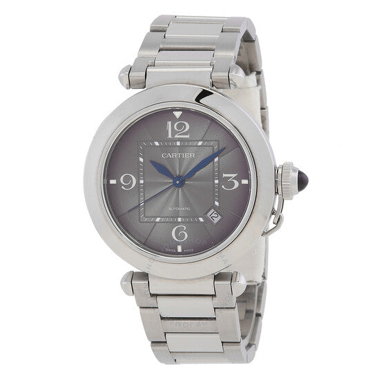 علبة وسوار من الفولاذ المقاوم للصدأ فضي اللون. إطار ثابت من الفولاذ المقاوم للصدأ فضي اللون. ميناء رمادي بعقارب زرقاء وعلامات ساعات رقمية عربية. مقياس دقائق حول الحافة الداخلية. نوع الميناء: تناظري. عرض التاريخ بين موضعي الساعة 4 و5. آلية حركة أوتوماتيكية. زجاج ياقوتي مقاوم للخدش. تاج كابوشون. غطاء خلفي شفاف. شكل العلبة دائري، مقاسها: 41 مم. إبزيم قابل للطي بزر ضغط. الوظائف: التاريخ، الساعة، الدقائق، الثواني. سلسلة باشا دو كارتييه. طراز ساعة فاخرة. علامة الساعة: صناعة سويسرية. ساعة كارتييه باشا دو كارتييه أوتوماتيكية للرجال بمينا رمادي WSPA0026.