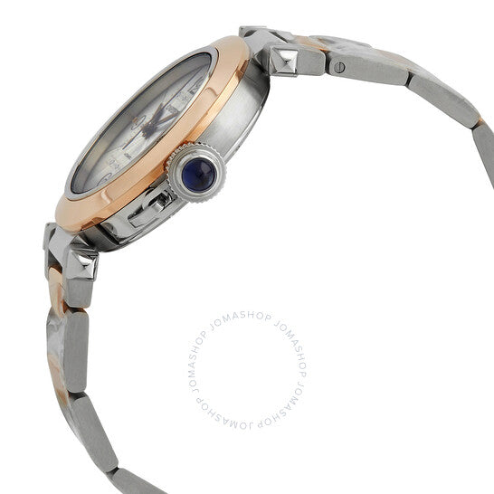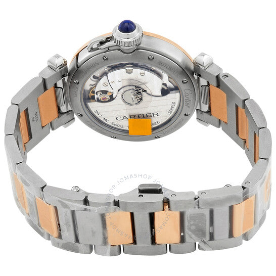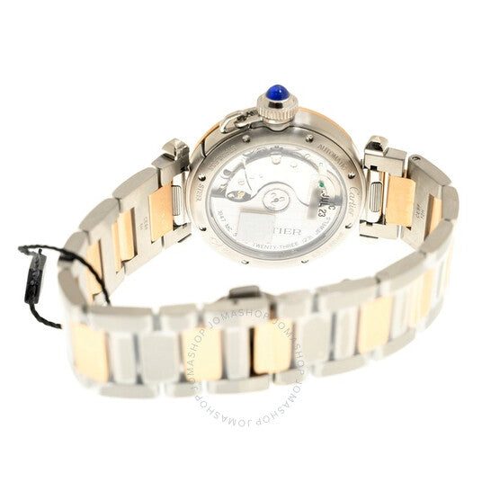علبة من الفولاذ المقاوم للصدأ مع سوار من الفولاذ المقاوم للصدأ بوصلات من الذهب الوردي عيار 18 قيراطًا. إطار ثابت من الذهب الوردي عيار 18 قيراطًا. ميناء فضي مزخرف بعقارب على شكل سيف من الفولاذ المزرق وعلامات ساعات مؤشرة. تظهر الأرقام العربية عند مواضع الساعة 3 و6 و9 و12. علامات الدقائق حول حلقة داخلية. نوع الميناء: تناظري. حركة أوتوماتيكية من كارتييه عيار 1847 MC، تحتوي على 23 جوهرة، تنبض بمعدل 28800 ذبذبة في الساعة، ولديها احتياطي طاقة لمدة 42 ساعة تقريبًا. كريستال ياقوت مقاوم للخدش. تاج مرصع بكابوشون لولبي. غطاء خلفي شفاف. شكل دائري. حجم العلبة: 35 مم. سمك العلبة: 9.37 مم. مشبك قابل للطي. مقاومة للماء حتى عمق 100 متر / 330 قدمًا. الوظائف: الساعة، الدقيقة، الثانية. معلومات إضافية: العلبة الأصلية، دليل الاستخدام (ملحقات كاملة). سلسلة باشا دو كارتييه. طراز ساعة فاخرة. ملصق الساعة: صناعة سويسرية. ساعة كارتييه باشا دي كارتييه أوتوماتيكية بمينا فضي للسيدات W2PA0008.
