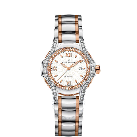 علبة من الفولاذ المقاوم للصدأ فضية اللون، مع سوار من الفولاذ المقاوم للصدأ ثنائي اللون (فضي وذهبي وردي) وذهب وردي عيار 18 قيراطًا. إطار ثابت مرصع بالألماس فضي اللون. ميناء أبيض بعقارب ذهبية وردية اللون ومؤشرات ساعات بأرقام رومانية. نوع الميناء: تناظري. عرض التاريخ عند موضع الساعة 3. حركة أوتوماتيكية من كارل إف. بوخرر، كاليبر CFB 1963، مع احتياطي طاقة لمدة 38 ساعة. كريستال ياقوت مقاوم للخدش. تاج قابل للسحب/الدفع. غطاء خلفي شفاف هيكلي. هيكل دائري الشكل، مقاسه 34 مم، سُمكه 9.65 مم. مقاومة للماء حتى عمق 30 مترًا / 100 قدم. الوظائف: التاريخ، الساعة، الدقيقة، الثانية. سلسلة باثوس ديفا. تصميم ساعة فاخرة. علامة الساعة: صناعة سويسرية. تنوعات المنتج: 366.131.0. ساعة كارل اف بوخرير باثوس ديفا أوتوماتيكية للسيدات 00.10580.07.25.31.01.